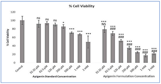 Effect of different concentrations of apigenin standard and apigenin formulation (optimized APG-PEGylated CNPs) on cell viability of A549 cells evaluated by MTT assay. Results are expressed as percentage mean ± SD (n = 3) (ns = not significant when compared with control; * = p < 0.05 when compared with control; *** = p < 0.001 when compared with control; NS = not significant when compared with same concentration group of apigenin standard; ### = p < 0.001 when compared with the same concentration groups of apigenin standard).