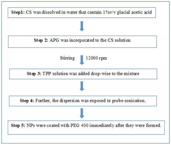 NPs were prepared by ionotropic gelation and were then homogenized and ultrasonicated [14,15]. For this, CS was dissolved in water that contained 1% v/v glacial acetic acid solution. Then, a weighed amount of APG was incorporated to the CS solution, and the added mixture has been homogenized at 12,000 rpm for 10 min. Throughout the process of homogenization, a TPP solution was added drop-wise to the mixture. Based on preliminary research, the CS-to-TPP ratio was determined as 4:1. Instantly, after homogenization, the dispersion was exposed to probe sonication (SONICS Vibra cell VC750, Newton, CT, USA) at 30% amplitude and pulsed at pulse 10 s for 20 min to generate nanoparticles. To keep the temperature increase under control, the dispersion was kept in an ice bath. NPs were coated with PEG 400 immediately after they were formed. Several batches were prepared by using the Box–Behnken design (BBD) to optimize the formulation. The schematic representation for the preparation of PEGylated-CNPs is as follows (Scheme 1).