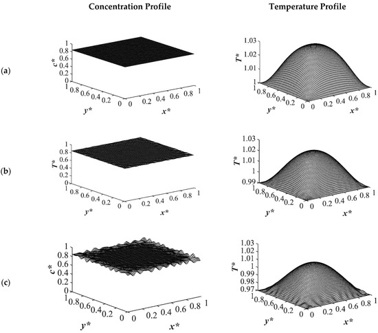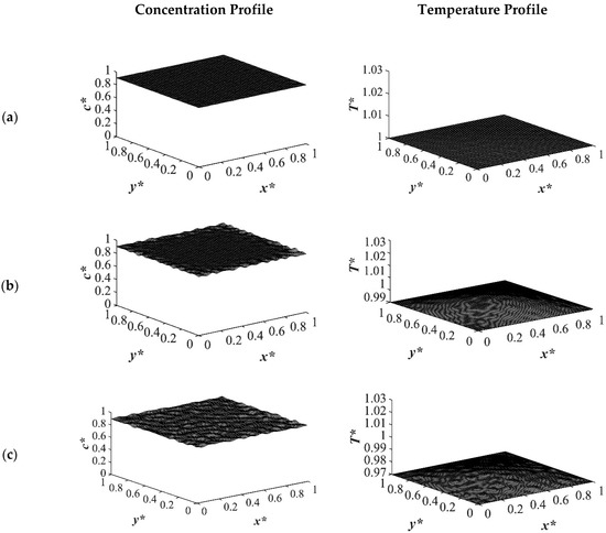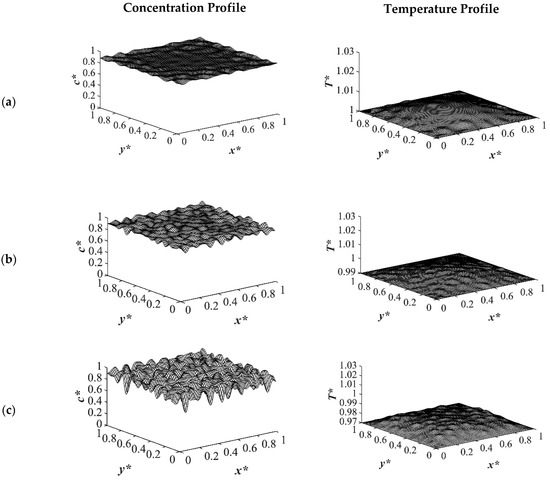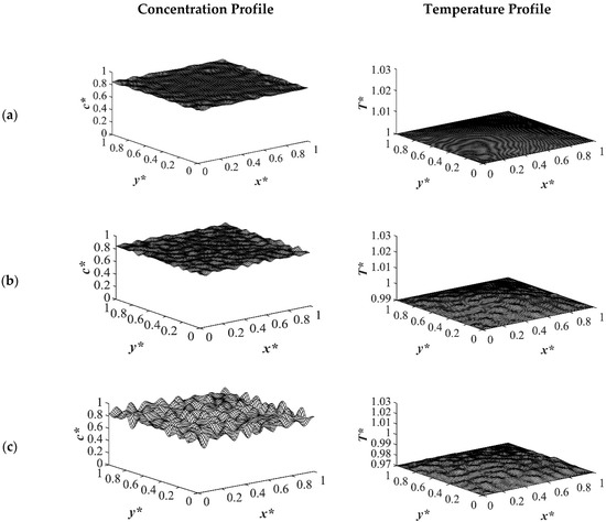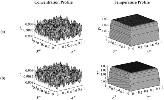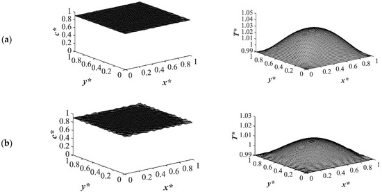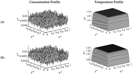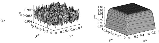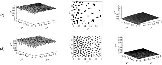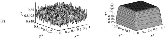 Figure 9 shows the phase separation and temperature profiles at t* = 8.01 × 10−4. The entire medium reached the late stage of spinodal decomposition and coarsened in the deep quench to T*q3 = 0.97 as presented in Figure 9a. Figure 9b presents the dimensionless concentration and temperature profiles of the quench temperature to T*q2 = 0.99. Compared to Figure 9a, more phase separation was carried out in the entire medium, and more heat was released due to phase separation. All the results provided for the case of critical quench, along with the results provided in Figure 2, Figure 3, Figure 4 and Figure 5, verify that deeper quench depths led to more phase separation with smaller droplet formation and a greater number of droplets. Besides, applying quench from four sides of the medium caused a gradient in the cooling rate between the sample boundaries and the interior parts, which led to anisotropic morphology formation.