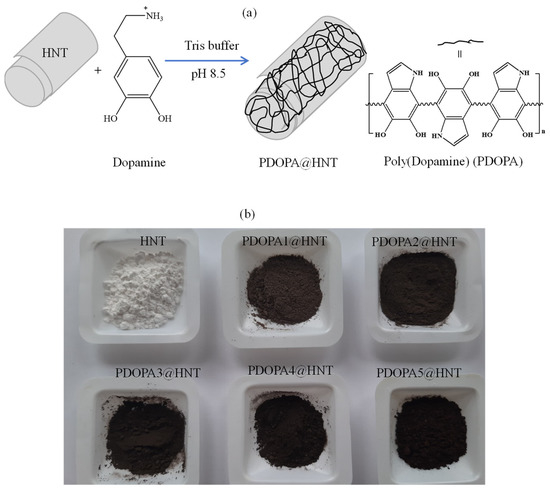 An alkaline medium was widely used for the self-polymerization of DOPA [51,52]. Previously, it was observed that PDOPA began to precipitate after 8 h of self-polymerization reaction time, and this time period was accepted as a control study [47]. Hence, a 6 h reaction time was adopted as the reaction time to coat HNTs with PDOPA in this study. The coating of HNTs with PDOPA was carried out in tris buffer, pH 8.5 at room temperature. A schematic representation of the coating of HNTs with PDOPA is illustrated in Figure 1a.