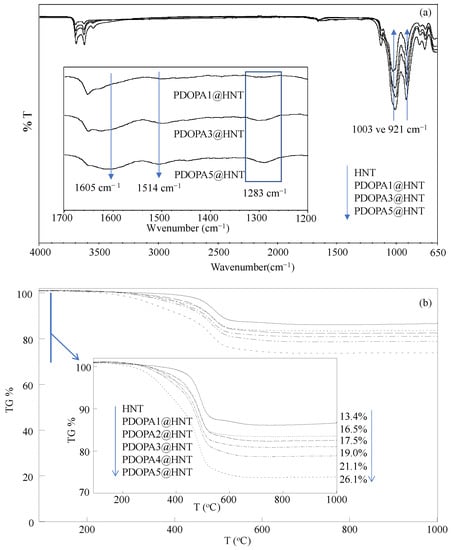 The FT-IR spectra of HNT and PDOPA1@HNT, PDOPA3@HNT and PDOPA5@HNT were also compared, and the corresponding spectra are presented in Figure 2a to confirm the success of PDOPA coating of HNTs. In the FT-IR spectra of the HNTs, the peaks around 3620 and 3690 cm−1 were assigned to the stretching vibrations of the inner and outer surface hydroxyl groups of all HNTs, respectively. The peaks observed at 921 and 1003 cm−1 are also characteristic for all HNTs and are attributed to the Al-OH and Si-O-Si moieties, respectively [54]. In the FT-IR spectra of PDOPA@HNT structures, it was clearly seen that as the number of PDOPA coatings increased to one, three, and five, there was a decrease in the intensity of the peaks at 921 and 1003 cm−1, which was attributed to Al-OH and Si-O-Si vibrations, respectively. In addition, in the FT-IR spectra given in Figure 2a, the inset for the peaks in the range of 1700–1200 cm−1 is shown; here, the peaks seen at 1605 and 1514 cm−1 on the HNT increase with DOPA coatings because of N-H and indole ring stretching [55]. In addition, the peak at 1283 cm−1 whose intensity also increases with the increase in the number of coatings shows the C-O stretching vibrations extending from the phenolic groups in the PDOPA structure [55].
