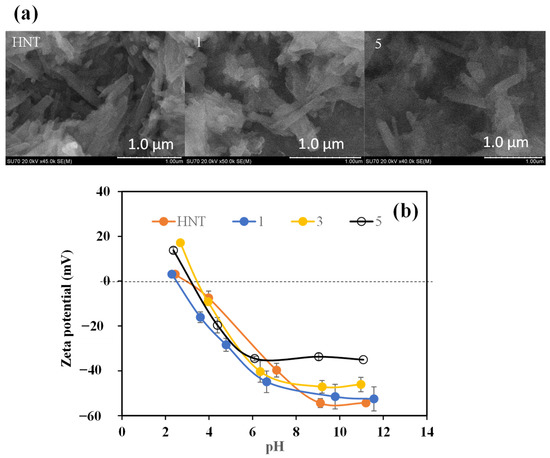 (a) SEM images of HNT, PDOPA1@HNT and PDOPA5@HNT clays, and (b) zeta potential values for HNT, PDOPA1@HNT, PDOPA3@HNT, PDOPA5@HNT at different pH values (scale bar 1.00 µm in the SEM images).
