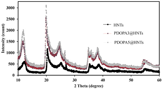 XRD patterns of HNT, PDOPA3@HNT, and PDOPA5@HNT particles.