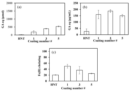 The antioxidant activities of HNT-based materials were determined using the total phenol content (TPC), total flavonoid content (TFC) and iron (II) ion-chelating capacity methods.
