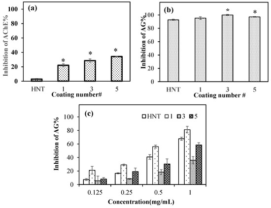 Different concentrations of neat HNT and PDOPA@HNT coatings were studied for AG enzyme inhibition. As demonstrated in Figure 6c, the AG enzyme inhibition abilities of neat HNTs and PDOPA@HNTs in the concentration range of 0.125–1 mg/mL are almost in a linear dependence with their concentrations. For example, HNT inhibited AG enzyme 40.8 ± 3.5% at 0.5 mg/mL concentration, whereas at the same concentration (0.5 mg/mL), PDOPA1@HNT, PDOPA3@HNT and PDOPA5@HNT were found to inhibit as 56.2 ± 2.2%, 18.5 ± 4.3% and 30.3 ± 7.6%, respectively.