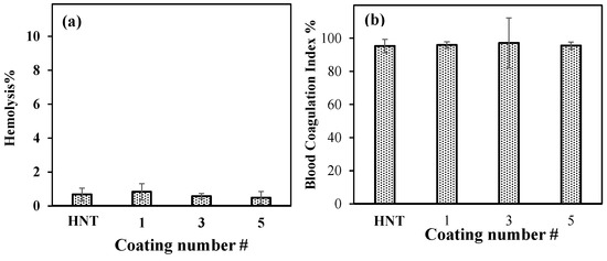 The blood compatibility of neat HNT and PDOPA@HNTs was investigated using 2.0 mg/mL particle concentration by hemolysis and blood coagulation tests. As shown in Figure 7a, the hemolysis index was less than 5% for all samples. The highest value was 0.8 + 0.5, while the others were even lower; therefore, neat HNTs and PDOPA@HNTs can be accepted as blood-compatible materials with low hemolysis indexes. The blood coagulating test results for HNT and PDOPA@HNTs are also given in Figure 7b.