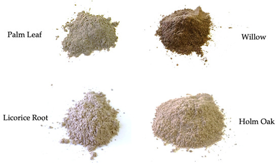 Four different types of lignocellulosic waste were used in this study, namely willow (W), holm oak (HO), palm leaf (P) and licorice root (L). These raw materials were sourced locally considering urban waste and forestry materials available every day, as the most common source of biomass. Licorice root was provided by Amarelli & Fallani, Rossano Calabro, Italy. Biomass from neatening palm leaf from parks and inner-city areas was provided by Ecoflora2 (Ardea, Italy). Willow and holm oak from marginal rural mountain areas were collected under the supervision of the authors.