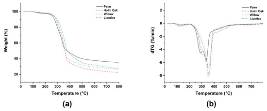 This behavior is different from that usually observed with other natural fillers [29,30,31,32,33], which is more similar to that featured by holm oak, willow fillers, and to a lower degree, by licorice root waste. The different intensity of the main cellulose peak degradation suggests a lower cellulose content in palm leaf compared to the other fillers, as confirmed by chemical analysis (Table 1). The high-temperature tail shown in Figure 4 is due to the degradation of lignin [34], which resulted in a higher charred organic material residue for palm leaf with respect to the other lignocellulosic fillers.
