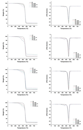 Thermogravimetric analysis provided information about the thermal stability of PP as a function of an increasing number of natural fillers. The results of TGA and derivative of the thermogravimetric analysis (dTG) for all composite formulations are shown in Figure 5.