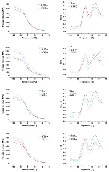DMA thermograms of storage modulus (left) and tan δ (right) of PP-based composites.