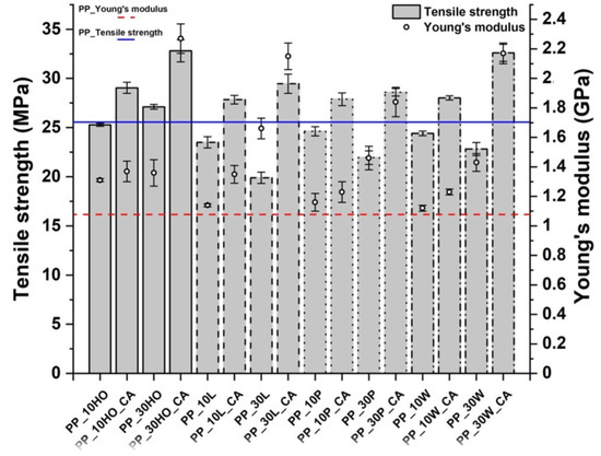 Tensile strength and modulus values of PP-based composites.
