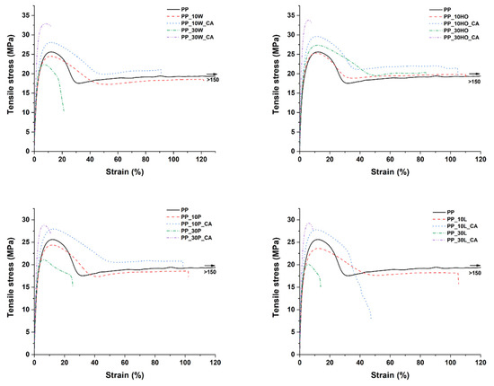 Typical stress–strain curves from tensile tests of PP-based composites.