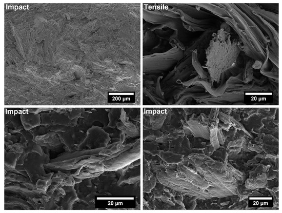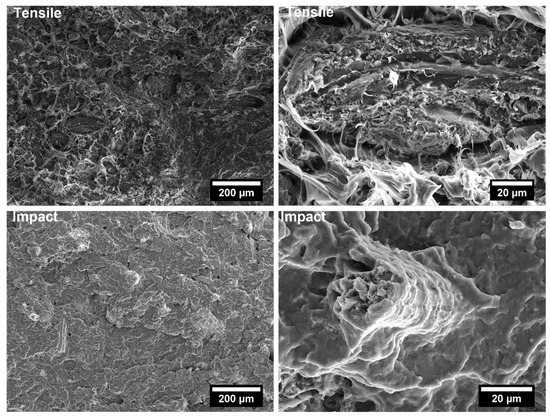 Generally, the inclusion of stiff fillers in a ductile matrix results in a significant reduction in fracture toughness [54,63], but the reasons are different and complex in nature, and no conclusive study is available to explain the poor impact performance of composites reinforced with natural fillers [64]. Some possible causes involve the reduced matrix ductility induced by the plastic constraint exerted by the stiff fillers, the stress concentration at filler ends and the poor filler/matrix interfacial adhesion. It can be mentioned that in many situations, the presence of fillers provides positive or negative influence depending on the interfacial adhesion [65]. In the present study, no remarkable differences among composite configurations were observed, but a general trend involving an increase in impact strength with increasing filler content and the presence of coupling agent can be highlighted [55,59,66,67]. The fracture surface showed a brittle character (Figure 9, Figure 10, Figure 11, Figure 12, Figure 13, Figure 14, Figure 15 and Figure 16), but the better filler/matrix adhesion enhanced the work of fracture of the interphase that resisted crack propagation, thus supporting the effectiveness of maleated PP.
