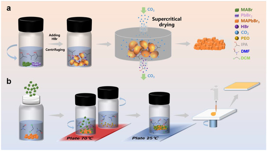 Preparation of MAPbBr3, PBC, and PPC. (a) Schematic illustration of the preparation of hybrid perovskite by supercritical drying. (b) Schematic illustration of the facile synthesis of halide-rich hybrid perovskite nanocomposite films. The blend solution was made from MAPbBr3, MABr, and PEO powder, then directly spin-coated into a bromine-rich nanocomposite film.
