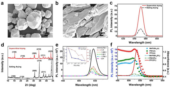 PL characterization of perovskite. SEM images of (a) supercritical drying and (b) baking drying at 5 μm. (c) The photoluminescence image of MAPbBr3 under both baking and supercritical drying methods, with an excitation wavelength of 365 nm. (d) XRD spectra related to different dry methods. (e) The fluorescence image of PPC films with different mass ratios of PEO/PBC in RH 10%. Inset: The image of PPC of variation of peak intensity and wavelength with PEO/PBC at different mass ratios. (f) The photoluminescence (the lines) spectra and absorption (the symbols) at the regions labeled MAPbBr3 (blue line and blue triangle), PBC (green line and green rhomb), and PPC (red line and red sphere).
