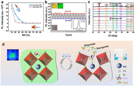 As a former exploration and analysis of PPC materials, it could be a good candidate for a humidity sensor. Humidity-dependence of PL spectra of PPC was investigated by varying RH from 10% to 90%, indicating that PL efficiency and intensity of PPC were sensitive to environmental humidity in Figure 3a. PL intensity of PPC decreased dramatically with the increase of RH and recovered after the RH decrease. The related PL spectra of PPC samples in different humidity environments were shown in Figure S4. It concluded that the PL of PPC could show a high response to the relative humidity in the range of 10–50%. To ensure the authenticity of the results to humidity sensitivity is not by chance, the PL intensity of 10 samples was investigated for statistics of cycling stability under two humidity states (10% and 50%) in Figure 3b. It could achieve the 22 cycles of PL intensity sensing to RH in this work, indicating the sustainable humidity sensitivity and stability of PPC in a moisture environment. It was noted that the PPC materials became non-colored, semi-transparent, and non-PL in the 50% humidity condition (inset i and iv of Figure 3b). After being placed in a low (10%) humidity environment, color and PL properties recovered immediately as shown in inset ii and iii of Figure 3b, suggesting the potential application of a sensitive indicator for humidity. The morphology of the PPC sample after humidity cycles was shown in the SEM images (Figure S5). This PL sensitivity of PPC materials to RH relied on the crystal structure. Therefore, the structural variation of PPC in different humidity conditions was revealed in Figure 3c and Figure S6. According to the XRD analysis, the plane (110) of PPC was strongly correlated with humidity, which can affect color and PL properties. The PL sensitivity to RH could recover after environmental humidity is reduced (inset iv of Figure 3b), corresponding to the recovery of crystal structure in Figure 3c. Therefore, the sensing mechanism is that the interaction between hydrone absorbed by PEO and N-H of MA+ group results in the collapse of typical crystal structure with humidity increase, leading to non-coloration and reduced PL intensity (Figure 3d). However, this could recover and could lead to the reconstruction of its crystal structure after the decrease of RH because there is no absence of precursor in perovskite encapsulated by PEO, which leads to the cycling ability of humidity-sensing. Based on this mechanism, the PPC illustrates the potential applicability of humidity sensors.