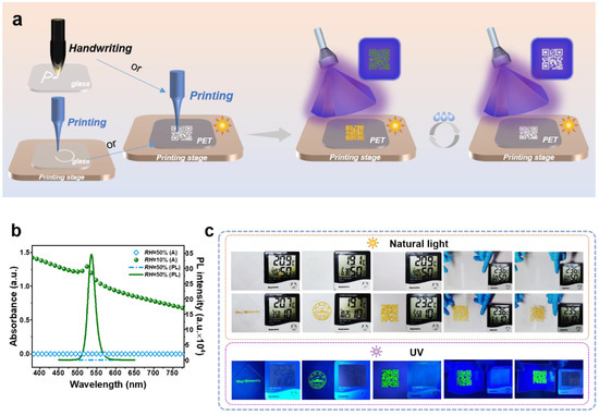 Application of PPC in dual sensing of temperature and humidity. (a) Schematic drawing of reversible fluorescent patterns on glass substrates and PET substrates by handwriting or printing. (b) UV-vis and PL spectra at different RH. (c) Humidity-sensitive words and patterns from PPC materials were designed via printing and writing on glass slides and flexible PET substrates.