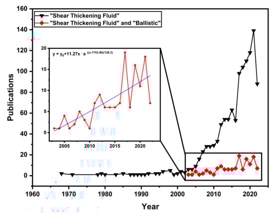 Publications per year for different keywords using the Scopus database. The black line represents the number of publications with the keyword “Shear Thickening Fluid”, while the red line represents the keywords “Shear Thickening Fluid” and “Ballistic”.