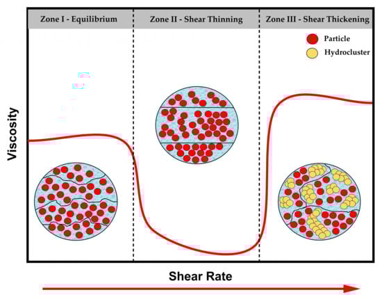 In Zone I, the particles are randomly dispersed in the medium at equilibrium. As the shear rate increases, the particles tend to organize as layered structures, which results in shear thinning, the opposite of shear thickening, with a consequent reduction in viscosity, indicated as Zone II in Figure. However, along with the increasing shear rate, the apparent viscosity reaches a threshold characterized by Zone III, indicating the shear thickening onset. The mechanism behind this zone can be explained by the disordering in those layered structures, which tend to form agglomerated particles resulting from hydrodynamic lubrication forces, called hydroclusters, responsible for this radical viscosity change [].