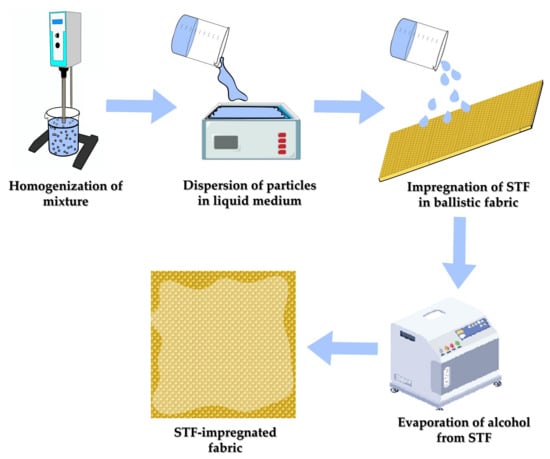 Although the aforementioned treatments provided enhancement to ballistic fabric, a different approach was envisioned in 2003 by Lee et al. [], when they proposed the use of STF to increase the ballistic strength of ballistic fabric without sacrificing areal density and flexibility. Their composite was made by the immersion of the fabric in the viscous solution, which acts between the yarns, increasing friction and shear thickening reaction to shear stress. The preparation scheme of the STF-impregnated composites is illustrated in Figure 3. Initially, the particles are mixed into a dispersing phase, resulting in a homogeneous suspension and disaggregated particles, with a mechanical, magnetic, or ultrasonic device [,]. Other devices have also already been used, such as an airbrush []. The viscous fluid is diluted in alcohol in a fixed proportion and mixed again to convert it into an easily dispersive liquid for uniform impregnation into the interstices of the fabric. After that, the fabric is finally soaked into the solution for a preset time and dried until the alcohol is volatilized. Different works suggest a padding process before drying for removing excess fluid, indicating an increase in yarn friction [,] due to a decrease in STF add-on, resulting in a more balanced friction factor, preventing the fabric from an easy pullout or fiber break under impact.