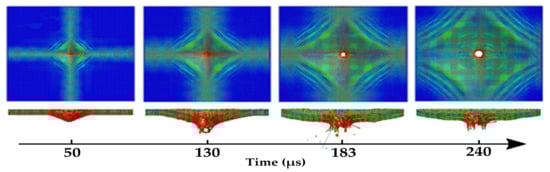 While reviewing textile-based soft armors in general, Mawkhlieng and Majumdar [] affirmed that the main energy absorption mechanisms in a ballistic fabric are out-of-plane deformation, yarn pullout, yarn rupture, fibrillation, friction and bowing. Crouch [] highlights the first two mechanisms, relating them to the cross and pyramid aspects, respectively, as presented the Figure 4. Khodadadi et al. [] stated that a combined mechanism of primary yarn tension, fabric deformation, frictional yarn/projectile slipping, yarn/fabric pullout, and fiber breakage dissipates the impact kinetic energy in fabric armors. For a ballistic fabric impregnated with STF, Srivastava et al. [] emphasize three energy absorption mechanisms related to the liquid–fabric interaction: inter-yarn friction, load transfer, and shear thickening mechanism. Gürgen and Kushan [] affirm that the influence of the shear thickening mechanism of non-newtonian fluids is not clear in several works. The authors attribute the mechanical strength enhancement primarily to friction along woven fabrics, which causes the load transfer to spread over a wider area and lower penetration depth. Despite this assertion, another work by Mawkhlieng and Majumdar [] analyzed different STFs that provided similar yarn pullout strength in an aramid fabric. The impregnation of fabric with the fluid with a higher thickening ratio (maximum viscosity to viscosity at the critical shear rate) resulted in higher impact strength, definitely evidencing the influence and contribution of the shear thickening mechanism on ballistic performance.