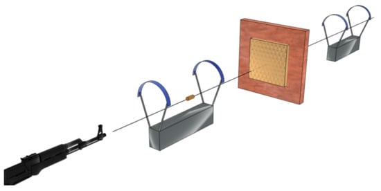 For a more suitable observation in real-life applications, the ballistic tests cover this requirement well []. This kind of analysis for soft armor is generally prepared based on the NIJ standards [], which classify the material in protection levels, as presented above in Table 1, based on the projectile caliber, geometry, material types, mass, velocity, and allowable back face signature (BFS) []. Karahan et al. [] detailed an actual high-velocity impact ballistic test, which adopts a few equipments, such as a gun barrel, to fire the projectile. Additionally, it used chronographs to measure the velocity of the projectile at different distances, clamping material, and plastilina clay to support the target when the study of BFS is required. Figure 5 presents a scheme of a ballistic test set.