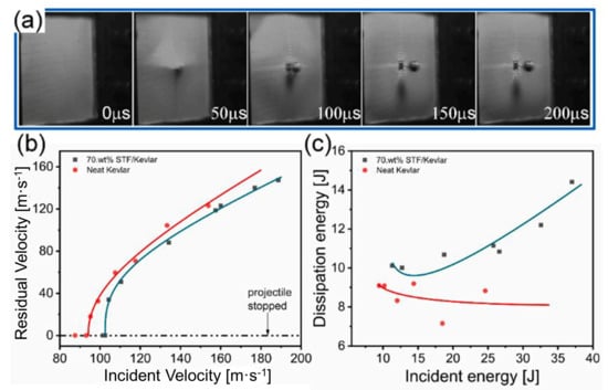 Zhang et al. [] investigated the ballistic performance of single-layer Kevlar fabrics impregnated with SiO2/PEG 200 STF at higher concentrations. Two concentrations were investigated: 0 wt% (neat Kevlar) and impregnated with 70 wt% STF (70 wt% STF/Kevlar). Ballistic tests were performed using 8 mm diameter spherical projectiles with an average incident velocity of 144 m·s−1. An interesting analysis of this paper is the fabric aspect during the impact of the projectile. Figure 7a illustrates the moment described on the neat Kevlar, recorded with a high-speed camera. It is observed that the yarn deformation is extended from the impact region of the fabric to its edge, spreading out in the transverse direction. This entire event occurs in a failure time of less than 100 s. Figure 7b presents the relationship between the residual velocity and different incident velocities for neat Kevlar and 70 wt% STF/Kevlar. It can be seen that the impregnated fabric showed a higher ballistic limit, about 10%. The relationship of the energy absorption of the two groups of samples is displayed in Figure 7c, in which it is shown that the energy dissipation of the 70 wt% STF/Kevlar sample is higher than that of the neat Kevlar. Thus, the authors indicated that the impregnation of SiO2/PEG STF into Kevlar at higher concentrations such as 70 wt% is advantageous from the point of view of ballistic performance for speeds below 200 m·s−1.