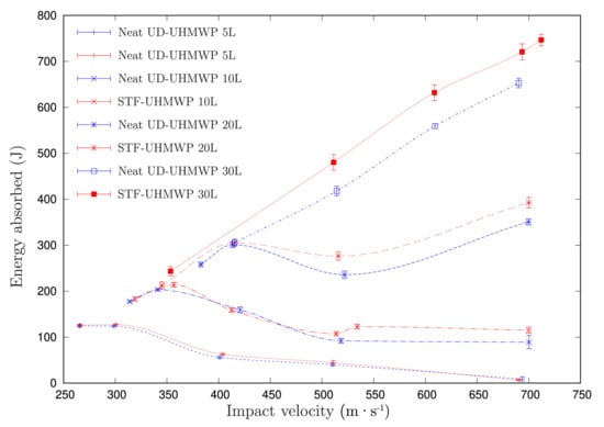 Mishra et al. [] evaluated the ballistic performance of UHMWPE fabrics impregnated with 40 wt% SiO2/PEG 400 STF panels varying the number of layers as 5, 10, 20 and 30 layers. The ballistic tests were conducted using an Al projectile, with a mass of 4g and length of 20 mm, with a velocity ranging from 250 to 700 m·s−1. In Figure 8, it is observed that, in comparison with the neat fabric, the STF-impregnated UHMWPE fabrics presented higher energy absorption in all conditions of projectile velocity, as well as higher values with the increase in the number of layers and impact velocity. This is attributed by the authors to the increase in the friction between fabric layers, which raises the strength against the projectile during the perforation process, in addition to the increased interaction time during the course of penetration between layers. This was the case for the samples with 20 and 30 layers of neat and STF-impregnated fabric under impact velocities greater than 500 m·s−1. The opposite effect occurred to the thinnest sample of five layers, which was ineffective under impact velocity higher than 450 m·s−1.