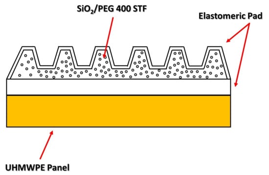 Schematic of the ballistic plate composed of Dyneema panels + elastomeric anti-trauma pads with shear thickening fluid. Adapted with permission from Ref. []. Copyright 2017, Sciendo.