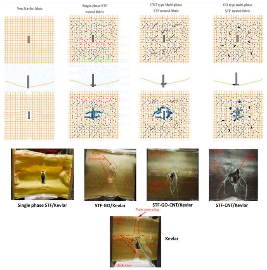 In Figure 10, an interesting schematic made by Liu et al. [] shows the deformation mechanisms of the fabric with the different types of STF, along with images of the samples after the ballistic test. Apart from the fabric impregnated with STF-GO, which remained intact after the ballistic test, all samples presented perforations in which the extension of the holes is similar to the width of the projectile. From the schematic, it is observed that the type of addition directly impacts the formation of the hydroclusters. The combination of GO and STF resulted in increased yarn friction, resulting in a greater global fabric deformation. The thickening mechanism of the STF occurred along the entire fabric, distributing the stress and reducing the damage to the Kevlar fabric. The multi-phase STF with CNT and CNT+GO displayed the thickening mechanism only in the triggered region, preventing the strain from spreading to the rest of the fabric due to lower load transfer [,]. As a result of the low load transfer in the weft of the fabric, the fabrics without added GO exhibited greater deformation, in addition to the presence of yarn fracture and yarn pullout.