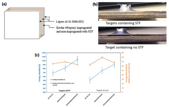 Haro et al. [] used laminated Al with impregnated Kevlar, adopting STFs of SiO2 particles with particle size between 0.2–0.4 m and PEG 400 as the liquid medium for particle dispersion. After fabric impregnation, the Al and Kevlar plates were bonded to the Kevlar fabrics using epoxy, as shown in Figure 11a, composing six ballistic panels configurations, on which ballistic tests were performed using 270 caliber Winchester ammunition. The authors reported that the impregnation of the fabric with STF between the layers of Al, resulted in greater integrity of the plates after the test in which, as shown in Figure 11b, a smaller deformation is observed in the samples containing STF. Another result that reinforces the positive action of the STF in this study is the results of absorbed energy, as shown in Figure 11c, which shows the superior performance of the groups of impregnated samples compared to the groups without STF treatment.