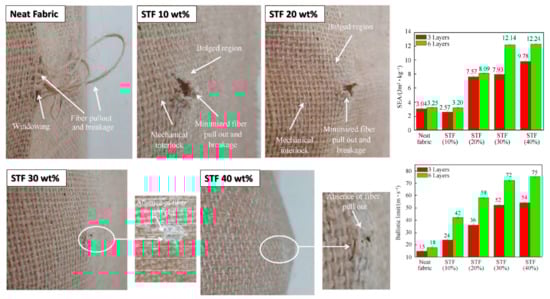 where is the SEA of the neat fabric or any reference group, and is the SEA of the impregnated fabric. Despite these parameters, it is worth mentioning that the ballistic response depends on several other features, such as those reported by Mawkhlieng and Majumdar []: