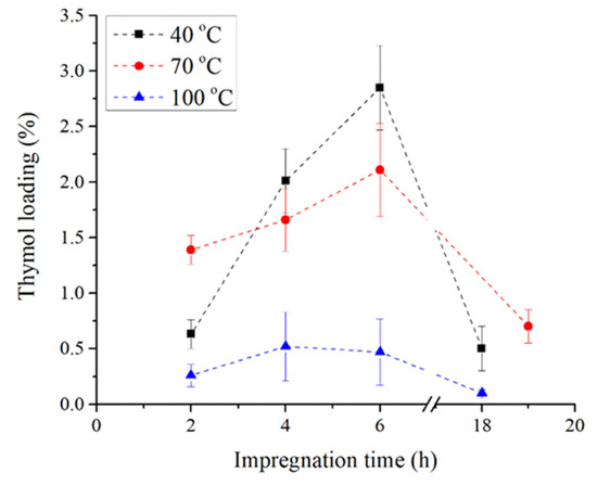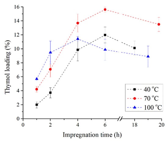 Operating parameters of the SSI process such as pressure, temperature, and time are the key factors in the scCO2 impregnation process as they directly affect the dissolution of thymol in the scCO2 and the diffusion of the supercritical fluid mixture (scCO2 + thymol) into a solid carrier. The objective of the conducted experiments was the fabrication of materials with thymol in an environmentally friendly way. It was previously determined that the pressure of 30 MPa and temperatures of 40 °C, 70 °C, and 100 °C provide a high solubility of thymol in the scCO2 and a satisfactory loading of thymol into polymers [25,26]. Hence, these conditions were selected for the current research. The resulting kinetics of thymol loading into TPS are presented in Figure 1. As it can be seen, the loading of thymol increased with the impregnation time, as previously reported for other polymeric materials [22,27]. The exception was the process performed at 100 °C wherein the desorption of thymol was noticed after 6 h of impregnation. Additionally, thymol loading increased with an increase in scCO2 density from 662 kg/m3 (density of scCO2 at 30 MPa and 100 °C) to 910 kg/m3 (density of scCO2 at 30 MPa and 40 °C) except for the processes performed for 2 h wherein the loading was higher at 70 °C (density of scCO2 at 30 MPa and 70 °C is 788 g/m3) than at 40 °C. This is probably due to a higher diffusivity of scCO2 at higher temperature, which affected the process in the first hours more than the thymol solubility. Namely, due to an increase in density (lower temperature), the solubility of an active component in scCO2 increases as well [1,24]. Thus, thymol concentration in scCO2 is higher at 40 °C, leading to higher loading in later impregnation (longer than 2 h). The loading will increase until the maximal loading of the active component in the material is achieved [28] or until the affinity of the active component towards scCO2 prevails [15,18]. An increase in the impregnation time up to 20 h led to a decrease in thymol loading into TPS with the final values of 0.5, 0.7, and 0.1% at temperatures of 40, 70, and 100 °C, respectively. These relatively low thymol loadings are in agreement with the literature reports, which testify for starch’s low affinity towards bioactive substances during the scCO2 impregnation process. Sousa et al. [1] reported the maximal loading of cinnamaldehyde into starch films of 0.25% under the conditions of 25 MPa and 35 °C after 15 h of impregnation process, while Ubeyitogullari and Ciftci [20] reported the maximal loading of phytosterol into nanoporous starch aerogels of 0.99% at 45 MPa and 90 °C after 3 h. Additionally, Milovanovic et al. [17] reported thymol loadings into starch xerogels in the range of 0.6%–4.0% after 24 h of the SSI at 15.5 MPa and 35 °C. Similar results were obtained in this study for TPS (0.3%–2.9%, Figure 1) with a considerably shorter operating time (2–6 h).
