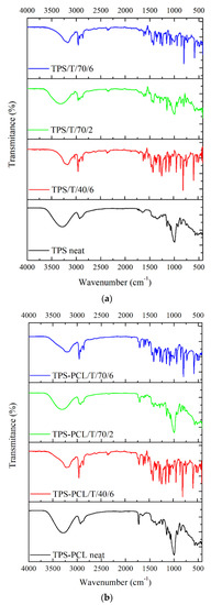 FTIR-ATR analysis was carried out to assess potential interactions between the thymol and TPS and the thymol and TPS–PCL after SSI at different processing conditions, and the obtained spectra are presented in Figure 3.