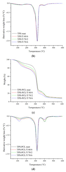 The TGA (a,c) and DTG (b,d) curves of neat and impregnated TPS and TPS–PCL samples.