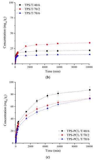 As can be seen in Figure 6c, the release rate of thymol was much higher in all TPS–PCL samples compared to the TPS samples. The highest release was obtained from TPS– PCL/T/40/6, with the final concentration reaching 87.2 mgth/gs. The samples TPS–PCL/T/70/2 and TPS–PCL/T/70/6 exhibited similar release kinetics to thymol. Both samples released thymol for 7 days (the concentration of thymol was ca. 73 mgth/gs) in a controlled manner. These findings reveal that the addition of 20 wt.% PCL to TPS had an important role in the thymol loading and directly on the release of thymol. Not only is PCL a biodegradable polymer, it is also widely used in systems for the controlled release of substances, recommending it for the development of functional materials [53].
