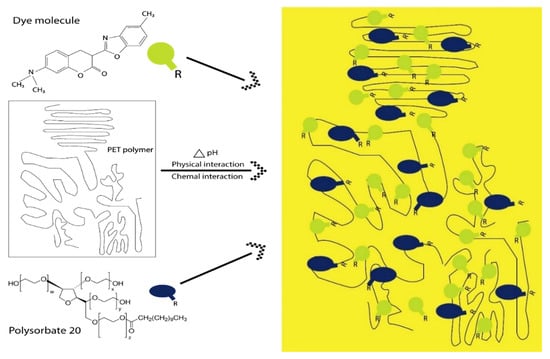 The possible interaction between dye, polysorbate 20, and fabric samples is shown in Figure 2. Because of the inherent chemical characteristics of the surfactant, polysorbate easily becomes oriented on the surface of the dyebath and forms micelle together with coumarin dye (C19H18N2O3) molecules, as investigated in our previous study [22]. The hydroxyl groups (-OH) present in the tail of the polysorbate confer solubility. In such cases, polysorbate acts as a host and coumarin dye as a guest molecule. Another fact is that polysorbate is a long-chain hydrocarbon and has a higher molecular weight compared to the coumarin dyestuff, which is helpful as well for the preceding. Under the acidic condition, the ester group (-R-COO-) of PET fabric will undergo an inclusion complex reaction with polyoxyethylene sorbitan monolaurate molecules (-O-CH2-CH2-O-) through hydrogen bonds, Van der Waals forces, and electrostatic interaction, and become a part of the host polymer chain [32]. This chemical interaction is caused by π–π* and n–π* transition from the lowest energy to a higher energy level. Various concentrations of dye with polysorbate 20 for protection against UV are listed in Table 1. Control samples were just dyed with fluorescent dye without the addition of polysorbate.
