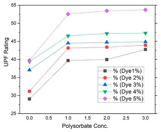 Here, the BD2 and SD1 were scanned during blank scans and scanning with the samples. The UV analyzer automatically calculated these readings and delivered them in graphical and text format. Here, the mean values of the control and dye-treated sample are depicted in Figure 3 and Table 2. The results reveal a similar trend of UPF rating for control dyed samples of 1%, 2%, 3%, 4%, and 5% as 29, 31, 32, 33.3, and 33.7, respectively. Previous studies revealed that fluorescent dyes have inherent UV protection characteristics [34]. Once the fabric was treated with the nonionic polysorbate-incorporated dye, the UPF readings changed to 43.92, 43.14, 44.48, 46.52, and 53.71, respectively. These results identify that with the addition of polysorbate the UV protection performance of the polyester fabric was improved substantially. Better UV protection performance of polyester fabric may be due to the possible complex interaction of ester groups (-R-COO-) of polyester fibers with the polyoxyethylene sorbitan monolaurate molecule (-O-CH2-CH2-O-) under acidic conditions, as discussed earlier. Figure 3 depicts the UV-protective performance of various dye concentrations with the addition of polysorbate. The 5% dye incorporated with 3% polysorbate shows the highest UPF rating and best performance, which is 53.71. Usually once the UPF of fabric is above 40 it is UV protective.