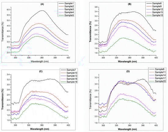 UV protection transmittance of UVA and UVB: (A) control samples, (B) UV chemical treated with 1%, (C) UV chemical treated with 2%, and (D) UV chemical treated with 3%.