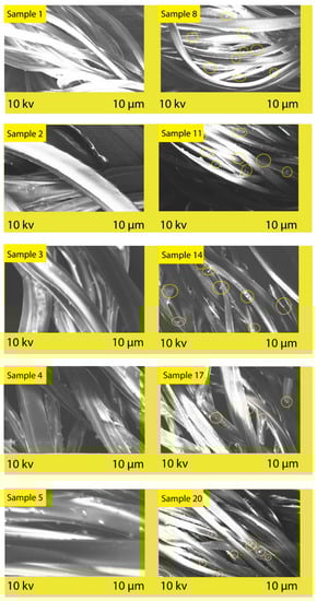 SEM analysis was performed to study the morphological changes at the surface of the PET fabric after polysorbate incorporation. As shown in Figure 5, the untreated samples have smoother surface characteristics compared to the treated ones. This depicts the roughness of morphology with the presence of the dye–polysorbate conjugate at the microscale. The possible reason for the roughness of the polyester fabric may be the interaction of the substrate and the polysorbate molecule. The scratches on the fabric surface were found to be increased after polysorbate treatment, which indicates that the UV protection strength improved with these microscale depositions. This is the outcome of the successful grafting of polysorbate and dye on the polyester fabric surface and performance against UV radiation [37].