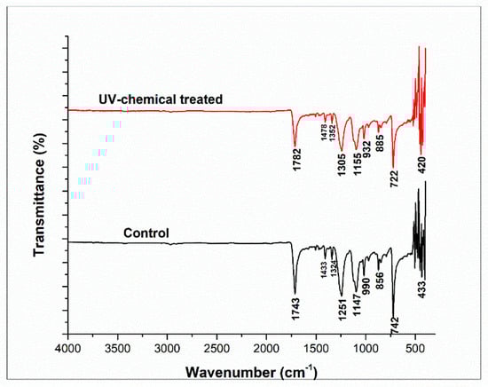 The functional group analysis for the surface of PET fabric was performed by Fourier transform infrared spectroscopy (FT-IR) with attenuated total reflectance (ATR) mode and through the accumulating scans of 120 with a resolution of 4 cm−1. Figure 6 illustrates the FTIR spectrum of the treated and control PET fabric. The presence of C–H, O–H, C–O, and C–O–C vibrations are characteristic peaks in the range between 1500–800 cm−1 [38]. The spectral peaks at 1743 cm−1 and 1782 cm−1 of control and treated PET fabrics correspond to the stretching vibration of the aromatic ring (-C=O). The peaks at 1433 cm−1 and 1478 cm−1 were also attributed to the aromatic C-C stretching and C-H in-plane bending, while the peaks at 1324 cm−1 and 1352 cm−1 were assigned to the CH2 wagging. The peaks at 1147 cm−1 and 1155 cm−1 were ascribed to the C-O vibration mode for the carboxylic ester group present in PET fabric [39]. The peaks at 742 cm−1 and 722 cm−1 appeared due to the bending vibration of the heterocyclic aromatic ring (=C-H). However, the peak intensity of the treated samples was lower due to the chemical interaction between fabric, dye, and polysorbate 20. A similar phenomenon for the treatment of PET fabric was observed in previous research [36].