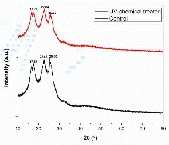 The X-ray diffraction patterns of the dyed PET fabric (control) and polysorbate 20 incorporated UV-chemical-treated PET fabric is shown in Figure 7. The findings of diffraction peaks at 2θ of 17.58°, 22.66°, and 25.50° were observed only for the dyed PET fabric. On the other hand, when the PET fabric was treated with polysorbate 20 incorporating fluorescent dyes, the diffraction peaks of 2θ appeared at 17.78°, 22.84°, and 25.50°. Here, all 2θ peaks followed the standard of JCPDS No. 49-2301 for PET fabric [40]. There were no differences between the control and UV-chemical-treated samples. It demonstrated that when original PET fabrics were dyed as well as UV-chemical-treated with polysorbate 20, the major structure of the fabric remained unchanged. A similar phenomenon was also observed for the surface treatment of PET fabric with dilute H2SO4 [41].