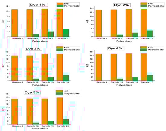 The color strength (K/S) is an easy way to define the depth of shade. A reflectance spectrophotometer (Datacolor/ 650, USA) was used to investigate the effect of polysorbate concentration on color strength. The instrument was standardized with 2° viewing geometry and a D65 light source with specular components included. Moreover, a larger aperture size (30 mm) was selected to obtain better perfection of reflectance values (R) covering the region of 400–700 nm wavelengths. Finally, K/S values were calculated with the Kubelka–Munk equation (Equation (3)). Table 1 and Figure 7 depict that the K/S values are almost independent of polysorbate concentration with a negligible increment after addition. The K/S values of 1%, 2%, 3%, 4%, and 5% control PET samples were 10.73, 13.26, 13.85, 14.88, and 15.14, which were almost constant after 3% polysorbate incorporation with readings of 11.01, 13.72, 14.83, 15.09, and 15.84, respectively (Figure 8). Therefore, polysorbate does not influence the color strength of dyed PET fabrics.