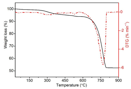 Figure 2 shows the TG thermogram of the produced ES filler in nitrogen. In the temperature range of 70–85 °C, a slight loss of mass of the sample related to water evaporation was observed [28]. The decomposition in the range of 260–340 °C, amounting to approx. 5.9%, is assigned to the decomposition of the organic substance contained in the ES. Higher decomposition temperatures of organic parts of the shell are associated with their strong interaction with calcium carbonate, which remained attached to the shell despite their initial washing away [49,50]. Decomposition in the range of 650–770 °C, 36.5%, is related to the decomposition of calcium carbonate concomitant with the evaporation of carbon dioxide and formulation of calcium oxide. The residue mass after decomposition at 900 °C is 49.3%. The proportion of organic parts in the obtained filler is about 6%, and the mineral part is about 93%, which is very consistent with previous literature reports [28]. The obtained biofiller, in the PVC processing temperature range, i.e., up to 200 °C, shows a slight loss of sample mass (1.5%), which may be related to the decomposition of the organic residue not removed during the washing of the shells.