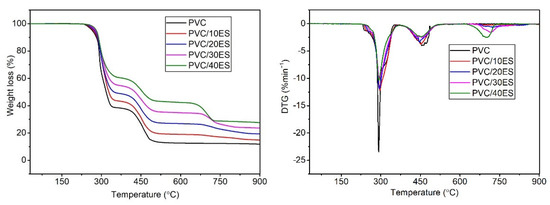TG thermograms of PVC and PVC/ES composites in nitrogen.