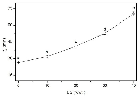 Figure 6 shows the dependence of the changes in the thermal stability time (tts) as a function of the biofiller content in the PVC composite. The time of thermal stability, i.e., the time after which the destruction of the poly(vinyl chloride) heated at 200 °C begins, which is manifested by the release of a gaseous HCl as a decomposition product, was 26.5 min for the unfilled PVC. Introducing a biofiller into the matrix extends the time of the thermal resistance of the composites. Adding a small amount of ES (10 phr) causes a significant elongation of tts (about 20%) compared to the unfilled PVC. Increasing the proportion of the ES to 40 phr increases the stability time by as much as 166%. These results indicate the beneficial effect of ground hen eggs on extending the thermal stability of the PVC composites following the mechanism described in the TG analysis and the higher specific surface area of the filler in contact with the heated PVC macromolecules. The protective influence against the heating of the PVC is also possible [64,65]. However, the explanation for extending the thermal stability time by as much as 44 min due to changing only the thermal conductivity value does not seem justified. It is also possible that the favorable influence of the ES on the processing properties, as shown based on plastographometric tests, decreased the temperature of the composite during the extrusion process. This may additionally affect the elongation of the tts of the produced materials with a biofiller.