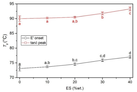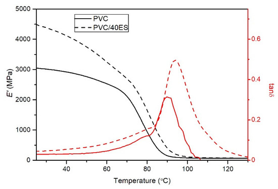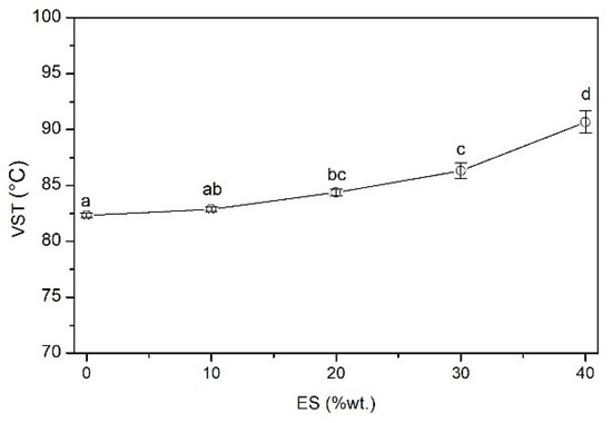 ES particles located in the PVC matrix significantly hinder the movement of segments of macromolecules, as evidenced by a significant increase in the VST and a significant increase in the glass transition temperature.