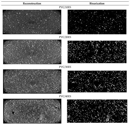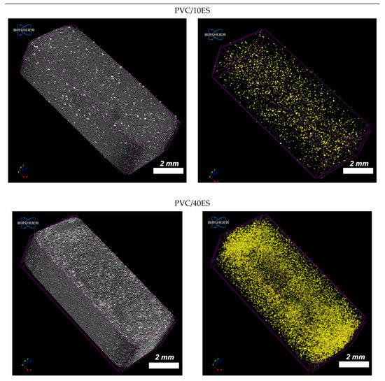 The average values of the ES particle sizes obtained with 3D analysis by the CTAn program are presented in Table 6. The average values are slightly lower when comparing the results obtained with a laser particle sizer but comparable to the 40.5 µm diameter mostly frequent fraction. It is probably an effect of the decreasing particle size during the polymer processing. The 3D visualizations of the scanned pieces by the CTvox program and the ES particle distribution in a PVC matrix are presented in Figure 12.