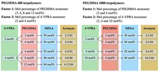 Based on one PEGMMA molecule, which is known to have an average of 9 or 23 repetitive units in 400 and 1000 molecular weights, respectively, the PEGMMA repetitive unit (DP = ni) in the terpolymer was calculated. The DP of PEGMMA allows the proportional calculation of 4-VPBA and NiPAAm DPs. Finally, the Mn (g/mol) was calculated by the sum of all moieties’ molecular weight present in the terpolymer structure multiplied by their calculated DP as described in Equation (3).