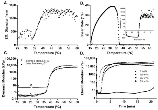 Thermal and mechanical characterization for 2:4:94 P400 terpolymer. (A) Effect of temperature on effective diameter measured by DLS. (B) Shear rate and viscosity as a function of temperature. (C) Rheological measurement of the dynamic modulus as a function of temperature. (D) Oscillatory rheological determination of the elastic modulus as a function of concentration at 37 °C.